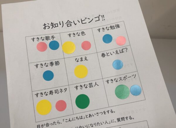 後半にはレクレーションとして、お互いに質問をしながらシールを集めてビンゴを完成させる『お知り合いビンゴ』を楽しみました。生徒と先生が混ざり、「好きな色は?」「好きなスポーツは?」など9つの質問を交換し合いながら交流を深めました。スタート時には全体的に緊張感も見られましたが、終わるころにはすっかりみんなが笑顔になっていました。